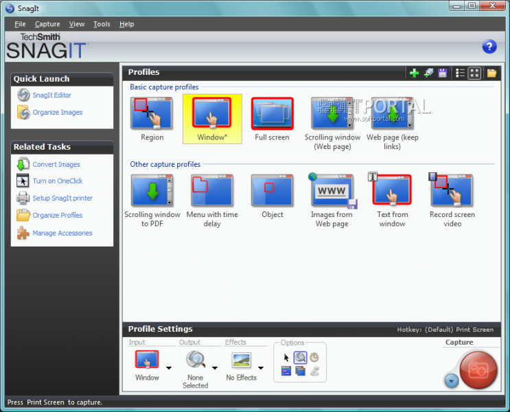 SnagIt - основное назначение программы - снятие скриншотов с экрана монитора, причем SnagIt умеет делать не только статичные графические "снимки" выбранной области, но и, например, записать в видео то, что происходит на экране, а также захватить картинку из приложений, использующих Direct X, DirectDraw и Direct 3D.